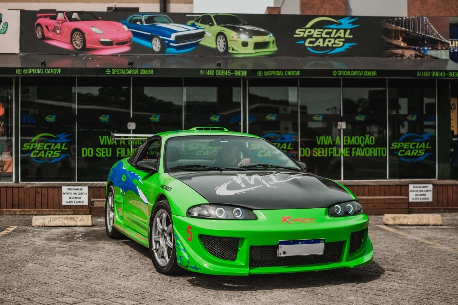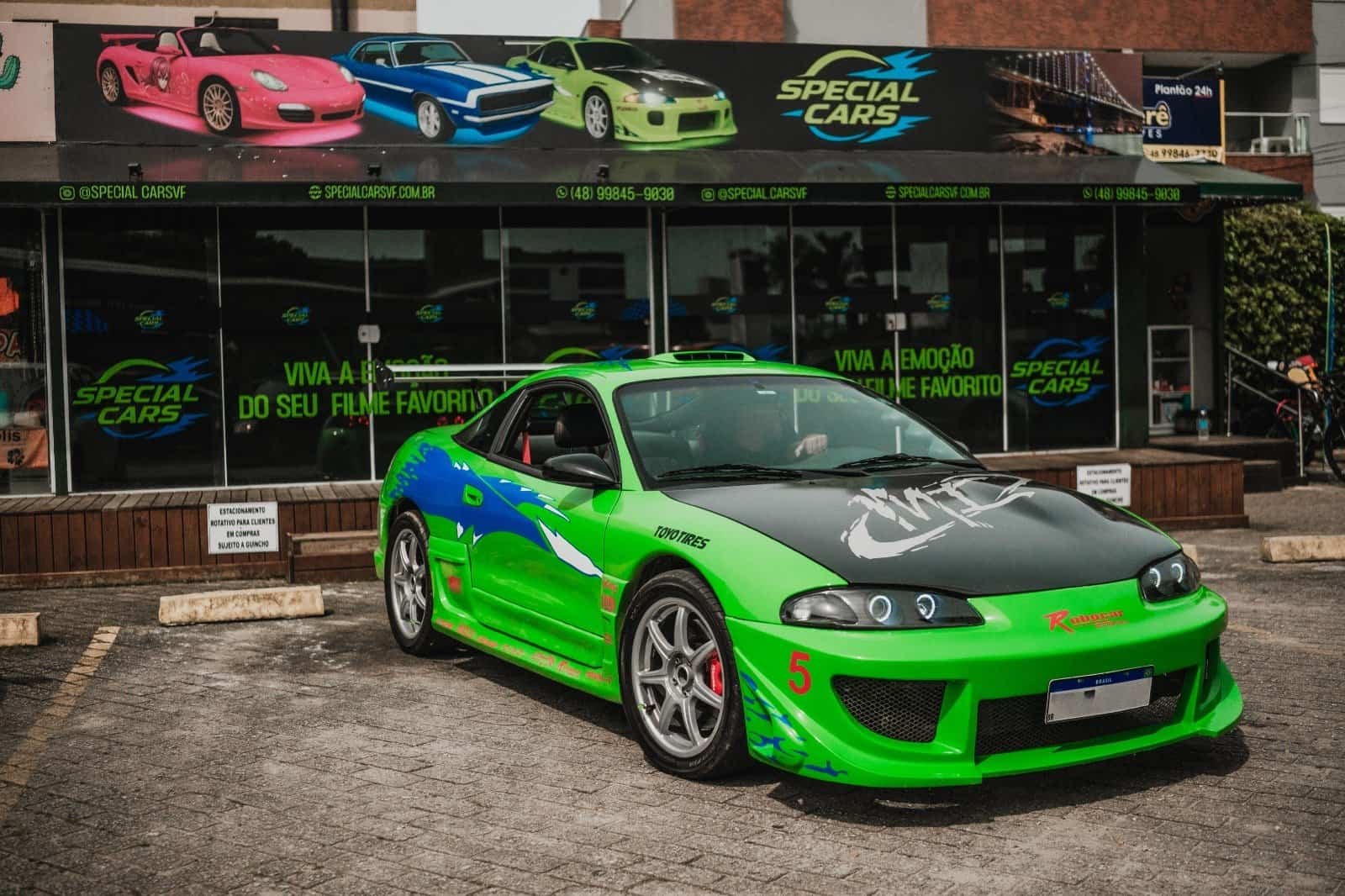 O icônico carro de Brian O’Conner no primeiro filme da franquia, com suas inconfundíveis luzes de neon e visual marcante.